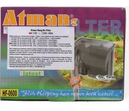 SOBRE O PRODUTO:O filtro externo Atman HF-600 é ideal para aquários de água doce até 140 litros. Ele tem uma construção de alta qualidade e design discreto e bonito. Seu sistema de filtragem conta com sistemas individuais para filtragem mecânica, química e biológica; possibilitanto que você troque cada um separadamente e quando achar conveniênte. Recomendamos a troca co carvão ativado a cada mês e limpeza mensal do filtro.
