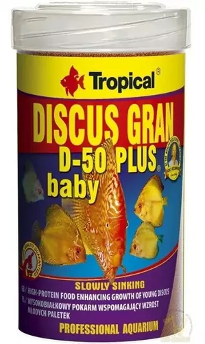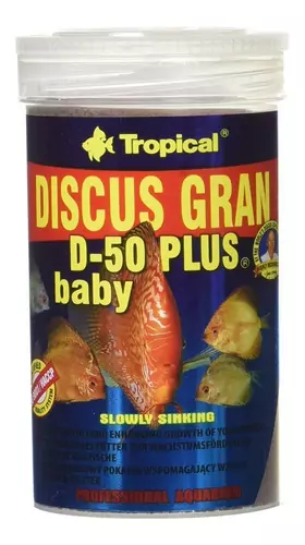 TROPICAL DISCUS GRAN D-50 PLUS BABY alimento altamente proteico promotor do crescimento de discus jovens TROPICAL DISCUS GRAN D-50 PLUS BABY alimento altamente proteico promotor do crescimento de discus jovens Granulado que se afunda lentamente com um excepcional teor de proteínas de fácil assimilação (55%) para discus jovens. As matérias-primas de origem animal e vegetal foram cuidadosamente selecionados para fornecer aos peixes um leque completo de proteínas, ricas em todos os aminoácidos essenciais, necessárias a um crescimento saudável. O sistema imunitário dos peixes jovens é fortalecido pelo beta-glucan e pelas substâncias ativas do alho, das leveduras, da spirulina e da alga Kelpae. A gema de ovo é fonte de lecitina, de fácil assimilação, indispensável para o desenvolvimento e funcionamento adequado do peixe. Para responder à elevada exigência de Omega-3 dos alevinos, este alimento foi enriquecido com ácidos gordos polinsaturados através de crustáceos marinhos e óleo de peixe. Quando alimentados regularmente com TROPICAL DISCUS GRAN D-50 PLUS BABY os discus jovens têm acesso a um conjunto equilibrado de nutrientes essenciais para assegurar um rápido crescimento e um desenvolvimento adequado. O alimento pode ser utilizado para alimentar alevinos de outras espécies de peixes com elevadas exigências nutricionais. EMBALAGEM 52G 66G