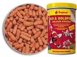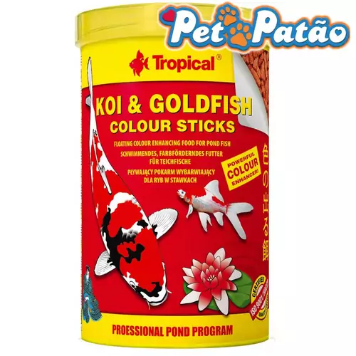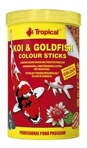 Alimento completo, em forma de bastão flutuante, promotor de cor, para carpas coloridas goldfishes e outros Ciprinídeos ornamentais, jovens e adultos, mantidos em lagos de jardim.