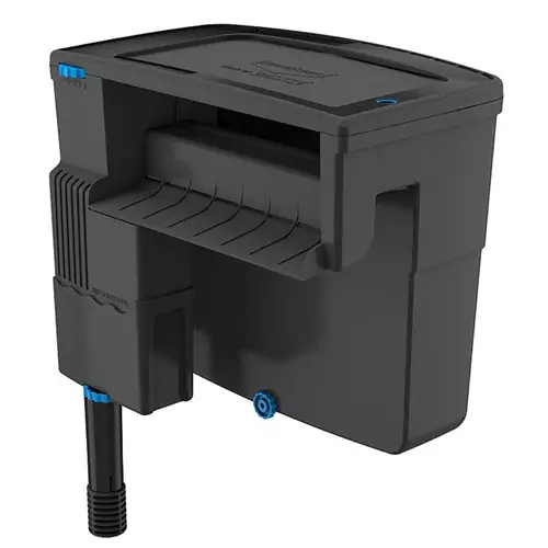 A bomba empurra a água para a cesta do filtro, entrando pelo fundo da cesta e sendo empurrada para fora. Um fluxo de baixo para cima garante que a água entre em contato com todos os meios filtrantes e não possa contornar ou passar por cima dos meios filtrantes, como acontece com os filtros traseiros com fluxo de trás para frente.