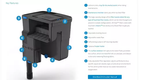 A bomba também é isolada e silenciosa, tornando-a excelente para aquários de escritório ou de sala de jantar, e tem um consumo de energia extremamente baixo para a quantidade de saída - o grande filtro Tidal 75 usa apenas 8 watts.