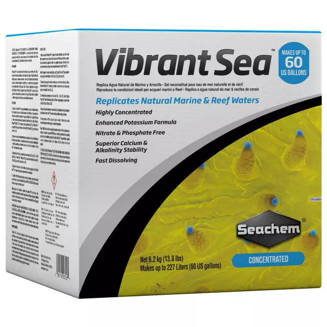 Vibrant Sea™ é uma mistura altamente concentrada de sais formulada para aquários marinhos e de recife que contém todos os componentes essenciais principais, secundários e traços encontrados em águas marinhas naturais, além da vantagem adicional de níveis aprimorados de potássio. Sua formulação é ideal para o ambiente de recife e fornecerá concentrações precisas de magnésio, cálcio e estrôncio na água do mar com alcalinidade e pH adequados para sistemas de aquário de recife fechado.