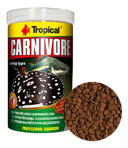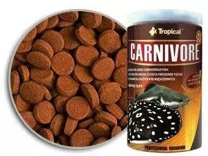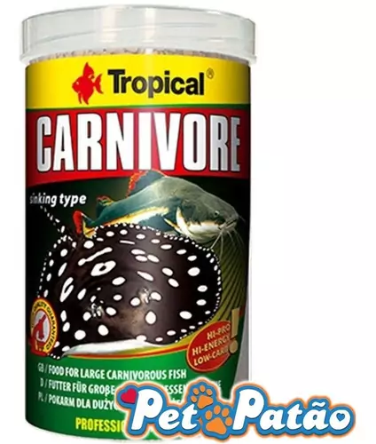 Alimento com alto teor de proteínas, em forma de grânulos submerso para os peixes do fundo. Carnivore é uma nova proposta da Tropical para os amantes de peixes carnívoros. Com alto teor de proteínas de fácil assimilação, satisfaz as necessidades tanto dos Bagres, como as grandes exigências dos peixes Raias, Cabeça de Cobra (Channidaes), etc. Carnívore é um excelente complemento da dieta para os Cascudos onívoros e interessante proposta para a maioria dos Ciclídeos, que buscam alimentos no fundo do aquário. A quantidade reduzida do amido protege os peixes carnívoros contra a engorda dos órgãos internos. A tecnologia HTST aplicada na produção do grânulo, garante uma alta assimilação dos componentes nutritivos, bem como na proteção biológica do produto. A rara hidro estabilidade faz com que, o granulado por muito tempo conserve a sua estrutura na água, não suja a água e não libera na água os seus valiosos ingredientes nutritivos. O Beta Glucano presente no alimento de uma forma natural apoia o funcionamento do sistema imunológico no organismo. O granulado Carnívore vem em nova embalagem, lata transparente, com um filtro para os raios UV. Esta embalagem associa a possibilidade de ver o produto sem ter que abrir a lata com absoluta garantia de segurança do alimento e das subst¿ncias nutritivas nele presentes.