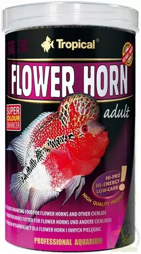 FLOWER HORN ADULT PELLET alimento promotor da cor para flower horn e outros ciclídeos. Alimento com alto teor de proteínas, em forma de bastões flutuantes para os ciclídeos Flower Horn e outras espécies da fámilia Cichlidae. Alimento disponivél em duas versões, em conformidade com o estado de crescimento dos peixes: Young (para os exemplares jovens) e Adult (para os adultos). O alto nivel da proteína bem assimilável tem influência no desenvolivimento dos peixes, os ácidos gordos Omega-3 e Omega-6 formação carácteristica para o Flower Horn e demais ciclídeos de grande porte da America do Sul e Central, o tumor gordo. Os ingredientes vegetais e a espirulina contida nos alimentos, são a fonte de corantes naturais, os quais fortalecem a cor dos peixes. A quantidade redusida do amido protege os peixes carnívores contra a degenaração dos orgãos internos. A tecnológia HTST aplicada na produção do granulado, garante uma alta assimilação dos componentes nutritivos, bem como na proteção biológica do produto. A rara hidroestabilidade faz com que, o granulado por muito tempo conserva a sua estrutura na água, não suja a água e não liberta na água os seus valiosos ingredientes nutritivos. Flower Horn Young Pellet e Flower Horn Adult Pellet, vem embalados num novo tipo de latas feitas de um matérial transparente, o que permite ver a aparência do produto na realidade. Apesar de ser transparente, o matérial usado no fabrico das latas perfeitamente protege os alimentos contra ação nociva da luz, incluindo a proteção contra os raios UV.
