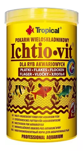 ALIMENTO BASICO INDICADO PARA TODOS OS TIPOS DE PEIXES ONIVOROS Alimento multi-ingrediente, derivado de matéria animal e vegetal de alta qualidade, cuidadosamente selecionados, destinado à alimentação diária dos peixes onívoros, jovens e adultos. Ingredientes altamente equilibrados, incluindo vitaminas e oligoelementos, garantem um saudável crescimento, assegurando as necessidades metabólicas requeridas. ICHTIO-VIT é amplamente usado por profissionais que variam a dieta com outros produtos da nossa linha PREMIUM e PROFISSIONAL. É recomendado o uso de ICHTIO-VIT em combinação com alimentos vegetais e para realçar as cores da nossa linha STANDARD, por exemplo, BIO-VIT e OVO-VIT, ou produtos similares da nossa linha PREMIUM, por exemplo, VEGETABLE e VITALITY & COLOR.
