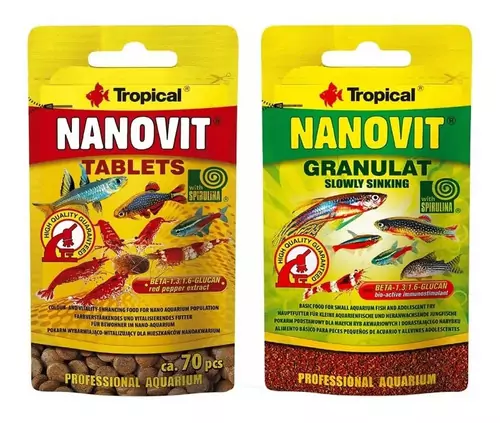 O TROPICAL NANOVIT TABLETS é um alimento promotor de coloração em forma de comprimidos pequenos, plano-convexos com um alto teor de carotenóides naturais e com um conteúdo de 14% de spirulina. Os comprimidos podem ser usados tanto como comprimidos que se afundam ou como autocolantes. Devido ao seu pequeno tamanho os comprimidos são particularmente recomendados para pequenas espécies de peixes omnívoros e carnívoros e para crustáceos e caracóis em nano aquários. Não carregam demasiado o tanque com excesso de substâncias orgânicas, o que facilita a manutenção de limpeza no nano aquário e em consequência limita o desenvolvimento de algas. As cores dos peixes são intensificadas pela: astaxantina natural, beta-caroteno e extracto de pimentão vermelho, que além disso influenciam positivamente muitos processos fisiológicos, entre outros, o crescimento e a reprodução. Os moluscos e os crustáceos presentes no alimento, incluindo as lulas saborosas, são fonte de proteína altamente assimilável. O imunoestimulante – beta-glucano – e as substâncias activas da spirulina fortalecem o sistema imunológico dos peixes e dos crustáceos.
