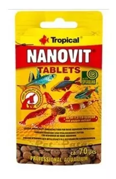 O TROPICAL NANOVIT TABLETS é um alimento promotor de coloração em forma de comprimidos pequenos, plano-convexos com um alto teor de carotenóides naturais e com um conteúdo de 14% de spirulina. Os comprimidos podem ser usados tanto como comprimidos que se afundam ou como autocolantes. Devido ao seu pequeno tamanho os comprimidos são particularmente recomendados para pequenas espécies de peixes omnívoros e carnívoros e para crustáceos e caracóis em nano aquários. Não carregam demasiado o tanque com excesso de substâncias orgânicas, o que facilita a manutenção de limpeza no nano aquário e em consequência limita o desenvolvimento de algas. As cores dos peixes são intensificadas pela: astaxantina natural, beta-caroteno e extracto de pimentão vermelho, que além disso influenciam positivamente muitos processos fisiológicos, entre outros, o crescimento e a reprodução. Os moluscos e os crustáceos presentes no alimento, incluindo as lulas saborosas, são fonte de proteína altamente assimilável. O imunoestimulante – beta-glucano – e as substâncias activas da spirulina fortalecem o sistema imunológico dos peixes e dos crustáceos.