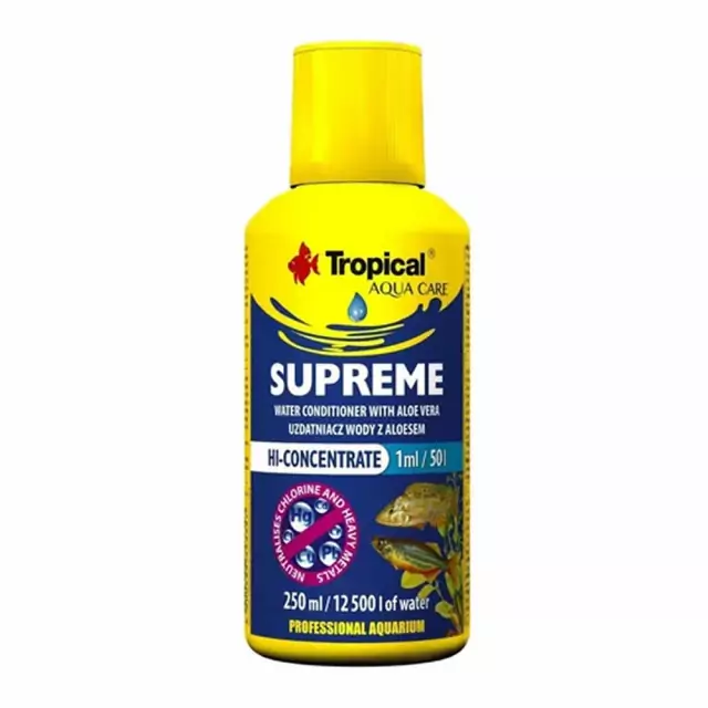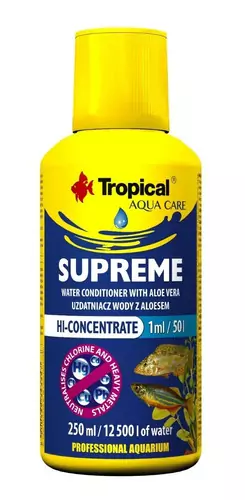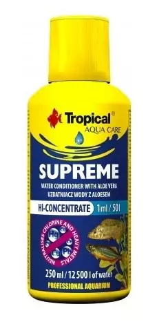 TROPICAL SUPREME é uma preparação super eficiente com extrato de aloe vera, destinado ao tratamento rápido da água da torneira usada para aletas de aquário. Recomendado para trocas de água e criação de um novo aquário. SUPREMA rapidamente neutraliza ou cloro no México e perigosa para peixes de aquário e peixes de metais pesados. Proteja os peixes contra os efeitos agressivos da água da torneira. Graças ao extrato de aloé, atua contra o estresse, acalma como abrasões e aceleração da regeneração de epiderme danificada, recuperação ou risco de inflamação. SUPREME atua desde o momento em que é derramado no aquário, e é por isso que funciona em casos urgentes, quando é necessário alterar muita água no aquário.